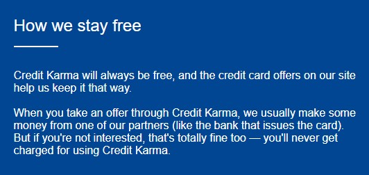 From Credit Karma’s own website, they claim you’ll never get charged for their services - even if you don’t want one of their recommended credit card options.