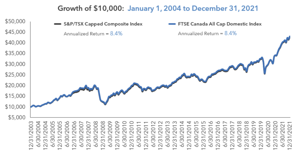 The chart below illustrates the growth of a $10,000 investment in both the S&P/TSX Capped Composite Index (tracked by XIC) and the FTSE Canada All Cap Domestic Index (tracked by VCN), showing a similar annualized return of 8.4% for both over the period.