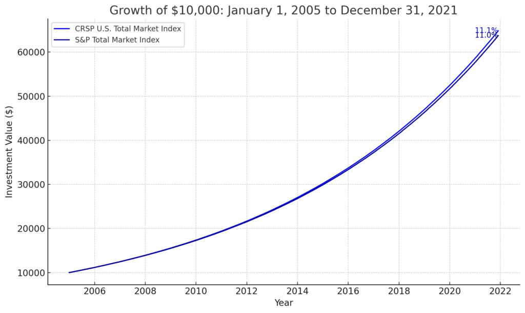 Comparative Growth of $10,000 Investments in CRSP and S&P Total Market Indexes