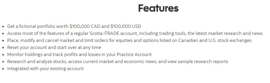 One of Scotia iTrade’s most innovative features is its practice account. You can set up a fictional portfolio worth $100,000 and have access to many of the same features of a regular Scotia iTrade account. You can utilize trading tools, market research, and monitor your progress.