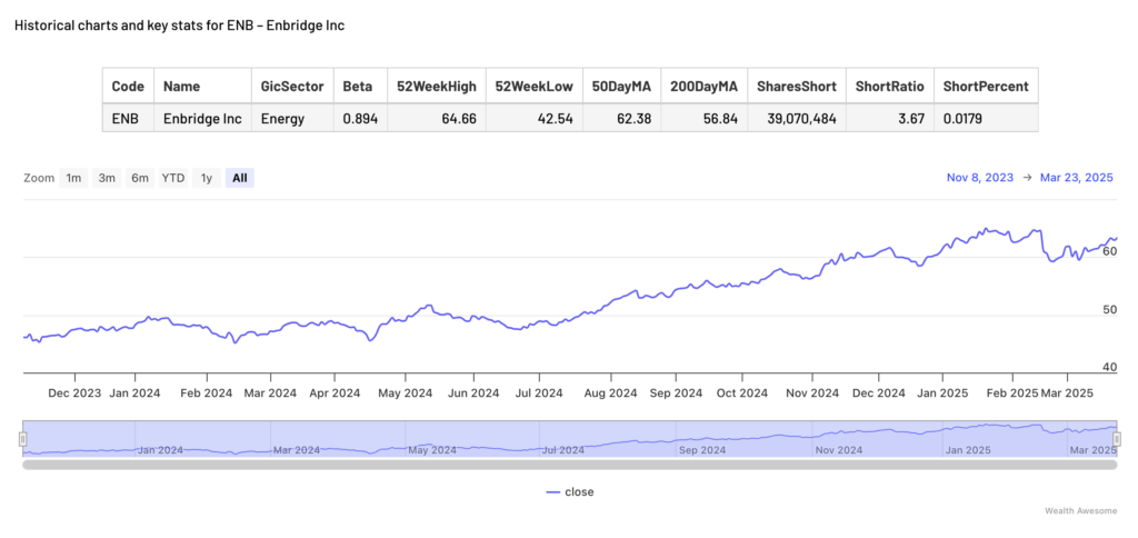 📈 Enbridge Inc. (TSX: ENB) has shown a steady upward trend over the past year, reaching a 52-week high of $64.66, supported by strong investor confidence and consistent performance in the energy sector.